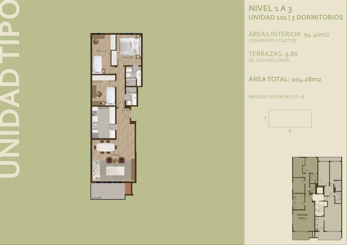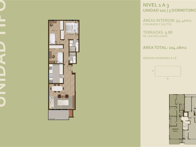 * Las superficies de los apartamentos incluyen muros divisorios hasta su eje, ductos, terrazas, balcones, prorrateo de área común, circulación vertical exclusivamente de planta.