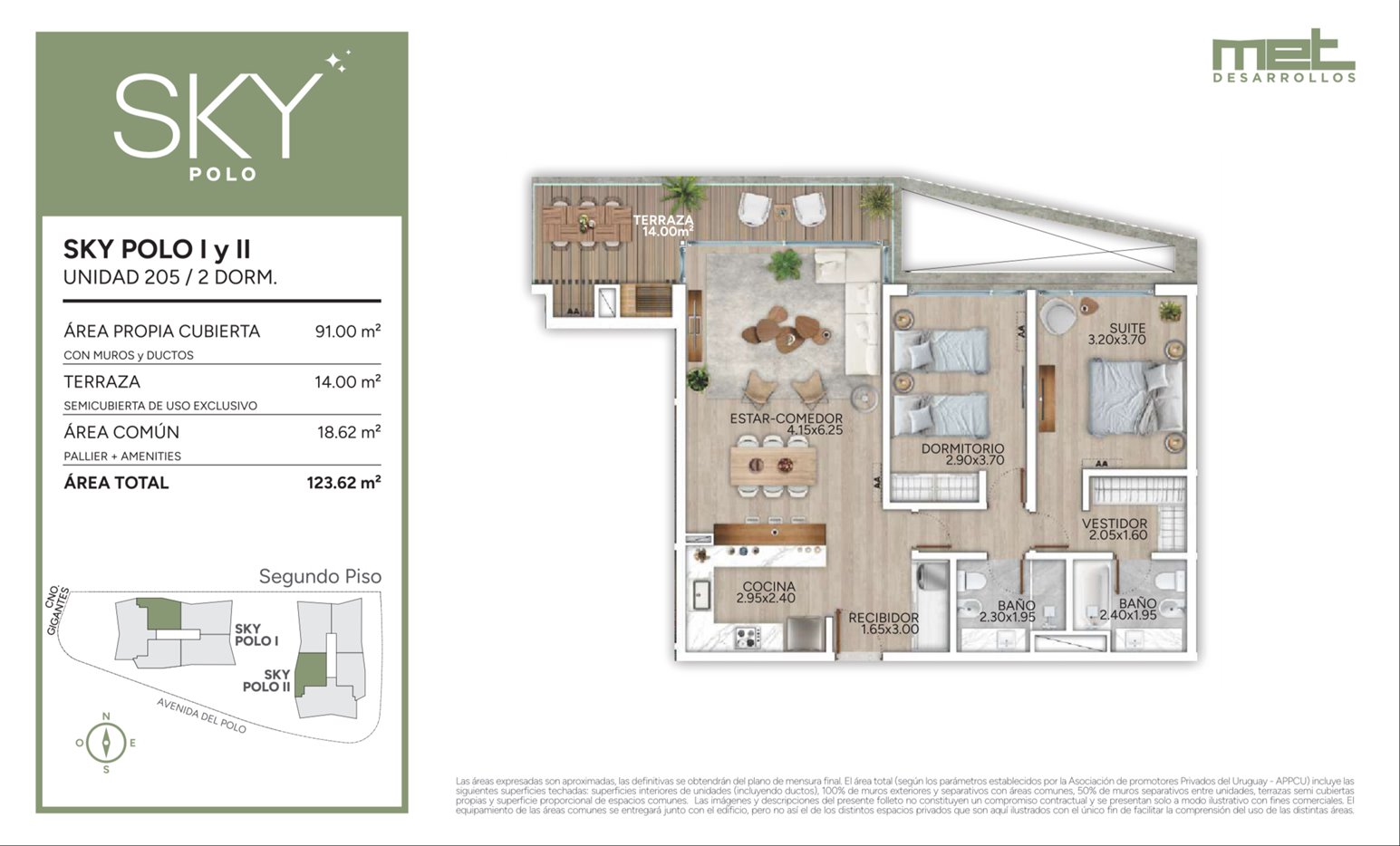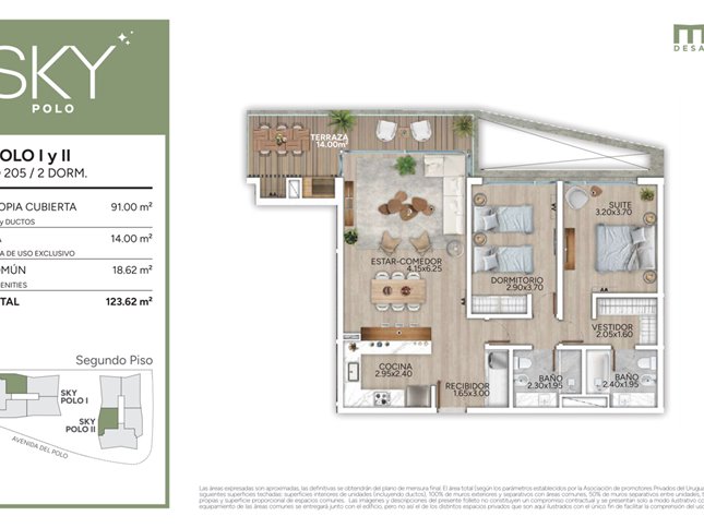 * Las superficies de los apartamentos incluyen muros divisorios hasta su eje, ductos, terrazas, balcones, prorrateo de área común, circulación vertical exclusivamente de planta.